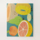 A food jigsaw puzzle featuring six, happy, fruit characters that include a pear, banana slice, cantaloupe, grapefruit, pineapple, and a peach.