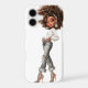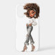 Make a statement with this editorial fashion phone case featuring a stylized glam character in pearl-studded denim. Her voluminous curls, jeweled hair accessory, and gold bracelets create a luxe silhouette, while the ripped jeans and crystal heels add a bold street-glam twist. Set against a pure white background, every detail — from the textured top to the confident hands-in-pockets pose — pops with clarity and boutique-coded charm. Perfect for fashion lovers who crave luxury styling, soft glam energy, and high-impact digital art.