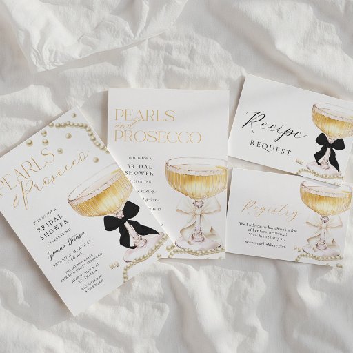 Celebrate the bride-to-be with this elegant "Pearls & Prosecco" bridal shower invitation. Featuring a delicate coupe champagne glass design with elegant pearls and a black bow detail, this invitation exudes charm and sophistication.