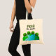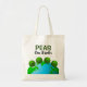 Funny Pun Peas On Earth in black and green lettering at the top of the design. Below are four adorable round green peas with black oval eyes and cute smiles, sitting on top of the earth.