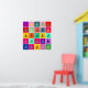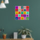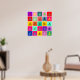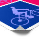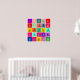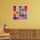 25 squares in various harmonious colours each with a man riding a bicycle motif in a complimentary, or sometimes a slightly clashing colour. Each bicycle motif is aligned or rotated slightly differently which gives the impression of a comic strip story of a bicycle trip in lots of psychedelic colours.