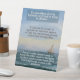 Pedestal sign image is a poster with a peaceful ocean scene in the background. The text on the poster is in white and brown, featuring a quote about questioning and trusting God. It emphasizes that it is natural for humans to question God's mysteries, but true spiritual growth comes from trusting in His guidance. The poster uses the analogy of a sailor navigating the ocean without knowing everything about it to illustrate the concept of trusting in God's guidance.
