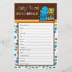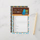 Baby shower games sheet card. Peek-a-Boo Monsters Baby Shower theme featuring blue, green brown colours and sprockets & stripes patterns. Matches MonkeyHutDesigns' baby shower invitation design #063.