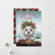 This adorable holiday greeting card features a cute Maltese Dog illustration wearing a festive crown wreath of winter florals, holly, pine, and berries, with snowflakes gently falling against a Snowing Woodland Forest Scene. The little Maltese is peeking over the snow-capped log to say hello! The playful text "Joyful Holiday Wishes" adds a warm seasonal greeting, and can be customised as you like. The reverse side is decorated with a classic plaid check, adding a traditional touch to the overall design. This cute, playful card is perfect for sending holiday cheer to family and friends, and the customisable name and date make it a personalised keepsake.