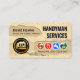 Over at the top lies your prestigious name and the slogan caption "Always The Trusted Craftsman" which you can change. To the right is the business name "HANDYMAN SERVICES" with a colourful handyman tools design just underneath. The tools can represent some of the services that you offer. Directly underneath these tools is the contact details with a gold "home landscape" logo you can use, to its left.