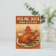 Retro food poster celebrating Peking Duck – Beijing’s iconic dish. A beautifully roasted golden-brown whole duck served on a large round plate, surrounded by thin pancakes, sliced cucumber, scallions, and sweet bean sauce bowls. Behind the dish, a faint silhouette of the Beijing city skyline with the Temple of Heaven adds cultural context.