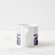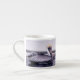 Profile of a pelican - the brown pelican in the original photograph by MaeFlowers on this Espresso Cup is gliding along the water of a canal on Florida's Gulf Coast. The side of a boat in the background shows the shimmering reflections of the blue water. The photo is in shades of blues, soft greys and browns, with a touch of yellow on the pelican's head.