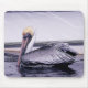 Profile of a pelican - the brown pelican in the original photograph by MaeFlowers on this Mousepad is gliding along the water of a canal on Florida's Gulf Coast. The side of a boat in the background shows the shimmering reflections of the blue water. The photo is in shades of blues, soft greys and browns, with a touch of yellow on the pelican's head.