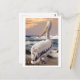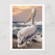 Postcard with the beautiful painting of a pelican standing on the beach at the edge of the ocean looking out into the sunset.