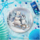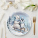 A polar bear and penguin are wearing earmuffs and scarves, joyfully riding a sled down a snowy slope in snowflakes.