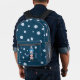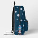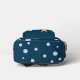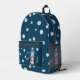 A cute blue backpack for kids or tweens featuring light blue polka dots and a penguin sipping on a cup off hot cocoa . Personalise it with aa name or monogram .