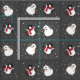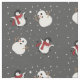 Penguin with red scarf with carrot-nose snowman on a snowy winter night.