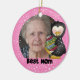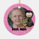 A pink background with white snowflakes, a penguin, text that reads "Best Mum", and an area you can add your favourite photo as well as customise the ornament with a quote or other text on a Penguin Best Mum keepsake ornament that's just too cute!