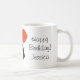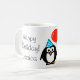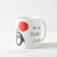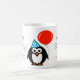 Penguin Birthday mug with red balloon and name. Personalizable design with funny penguin cartoon wearing a party hat and holding a balloon.