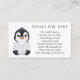 A book request insert card for baby shower. Featuring watercolor penguin with poem: "ONE SMALL REQUEST, WE HOPE NOT TOO HARD PLEASE BRING A BOOK INSTEAD OF A CARD THEY'LL CHERISH THE BOOK, WELL LOVED OR BRAND NEW PLEASE SIGN THE INSIDE WITH A MESSAGE FROM YOU!"