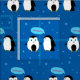 Winter theme design of cute penguins in snowflakes background. The female penguin with long lashes is saying "I love you!" to the chubby male penguin.
