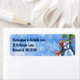 This winter holiday address label design features two enchanting penguins wearing colourful holiday hats. They are standing under mistletoe against a charming blue and white snowflake background.