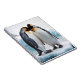 Two penguins stand closely together on a small ice floe surrounded by icy waters and distant glaciers
