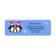An adorable penguin family wearing stripey scarves and festive hats, on a blue background with a handful of snowflakes. The text for the greeting and the name and address is fully editable - just type in the boxes.