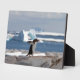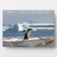 A Gentoo penguin walking in front of an arch out of ice. The image was taken in Antarctica.