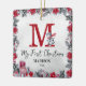 Cute baby monogram red christmas ornament featuring a washed out grey background, elegant watercolor xmas florals & foliage, adorable baby penguins, snowman, gifts, the childs initial, name, year, the saying 'my first christmas', and the stats of the baby.