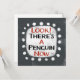 An irreverently weird typographic animal design that says "Look! There's A Penguin Now". It features black and red text on a white rectangle with funky, playful white dots surrounding it, all on a grey background.