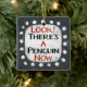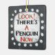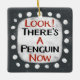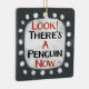 An irreverently weird typographic animal design that says "Look! There's A Penguin Now". It features black and red text on a white rectangle with funky, playful white dots surrounding it, all on a grey background.