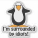 I'm surrounded by idiots! Funny and sarcastic insult with a black and white penguin with orange feet and beak graphic. Penguin Humour cartoon drawing. Wild animal illustration design with a saying/quote.