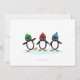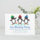 Three cute penguins in woollen caps of primary colours are slip sliding around in this bright and happy ice skating themed birthday party invitation.
