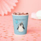 These personalised paper party cups are perfect for birthday parties and Christmas parties with their cute illustration of a penguin wearing glasses and holding a balloon against a light blue background. Use the fill-in-the-blank template field to easily personalise these party supplies with your own name or message.