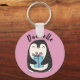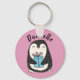 This adorable personalized keychain makes a great small personalized gift or stocking stuffer. These keychains also make great party favors for penguin-themed birthdays and holiday parties. This keychain features an illustration of a cute penguin holding a wrapped present against a pink background. Use the template field to personalize this keychain with a your own name or short message.