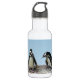 This water bottle features African Penguins standing on a rocky ledge in front of a blue sky. They are aquatic, flightless birds whose wings have become flippers. Each has a black stripe and black spots on the chest. The pattern of spots is unique for every penguin, just like human fingerprints. They have pink glands above their eyes and pink and black feet.