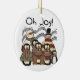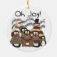 Two snowmen and five penguins sing holiday carols and text reads "Oh Joy!" on keepsake holiday ornaments.