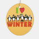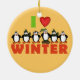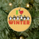 A group of penguins dressed in winter hats and scarves and text that reads "I Love Winter" on keepsake holiday ornaments perfect for penguin lovers!
