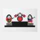 A cute group of penguins play musical instruments! One penguin rocks out on the drums. Another penguin plays the electric guitar and a third plays the electric bass.