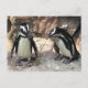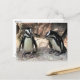 This postcard features two adorable African Penguins standing on a rocky ledge.  They are aquatic, flightless birds whose wings have become flippers.  Each has a black stripe and black spots on the chest. The pattern of spots is unique for every penguin, just like human fingerprints. They have pink glands above their eyes and pink and black feet.