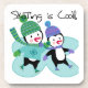 Two penguins ice skate on the frozen pond dressed in striped, colourful winter hats, scarves, and mittens and black text reads Skating is Cool on skating theme T-shirts, mugs, cards, bags, keepsakes, pillows, hoodies, stickers, and much more!