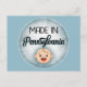 This funny postcard features a cute white baby face that says "Made In Pennsylvania" on a blue background. Perfect for new baby announcements or just for fun.
