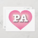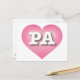 This postcard features a calm, cool, and collected pink heart with a white-washed centre containing the bold white upper case letters PA, the official abbreviation for the state of Pennsylvania, the keystone state. The reverse side of the postcard is blank, awaiting your handwritten sentiments or customised text.