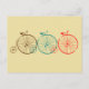 Overlapping rainbow red, brown and teal penny farthing old school bicycles with a distressed look.