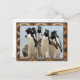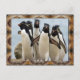 Six Penguins Walking along the ocean on the sandy beach. With a big rock and the nice baby blue sky. This postcard has a abstract brown frame.