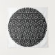 This is a Penrose tiling, a type of geometric pattern that is aperiodic, which means that it has no translational symmetry. They may however have reflection and fivefold rotational symmetry. This circular Penrose tiling is a P3 rhombus tiling with acute and obtuse rhombi. This design has a medium "M" tile density and another "style" factor gamma (g) equals 0.25. The acute rhombi are white and the obtuse rhombi are black on a white background, there are thin black borders around each tile.