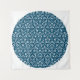 This is a Penrose tiling, a type of geometric pattern that is aperiodic, which means that it has no translational symmetry. They may however have reflection and fivefold rotational symmetry. This circular Penrose tiling is a P3 rhombus tiling with acute and obtuse rhombi. This design has a medium "M" tile density and another "style" factor gamma (g) equals 0.25. The acute rhombi are white and the obtuse rhombi are ocean blue on a white background, there are thin black borders around each tile.