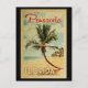 A uniquely retro mid-century modern Pensacola Florida art print in vintage travel poster style. It features a curved palm tree on sandy beach with ocean under a blue cloudy sky.