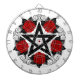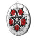 Black pentagram with pattern, decorated with blooming, red roses with leaves on white background. Tattoo style.