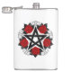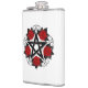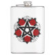 Black pentagram with pattern, decorated with blooming, red roses with leaves on white background. Tattoo style.