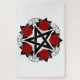 Black pentagram with pattern, decorated with blooming, red roses with leaves on white background. Tattoo style.