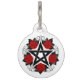 Black pentagram with pattern, decorated with blooming, red roses with leaves on white background. Tattoo style.