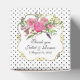 Elegant wedding favour box done in a black and white tiny polka dot background. The top of the box has a decorative gold and white text plaque, with lovely pink watercolor peonies, decorating the top. Black custom text ready to personalise. Lovely little gift box for candies and anything else you want to give your guests.