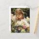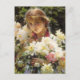A fine art postcard with the painting by Charles Courtney Curran (1861-1942), Peonies (1915). An American Impressionist painter of figures and landscapes. A beautiful young woman holding a bouquet of peonies in white and pink.